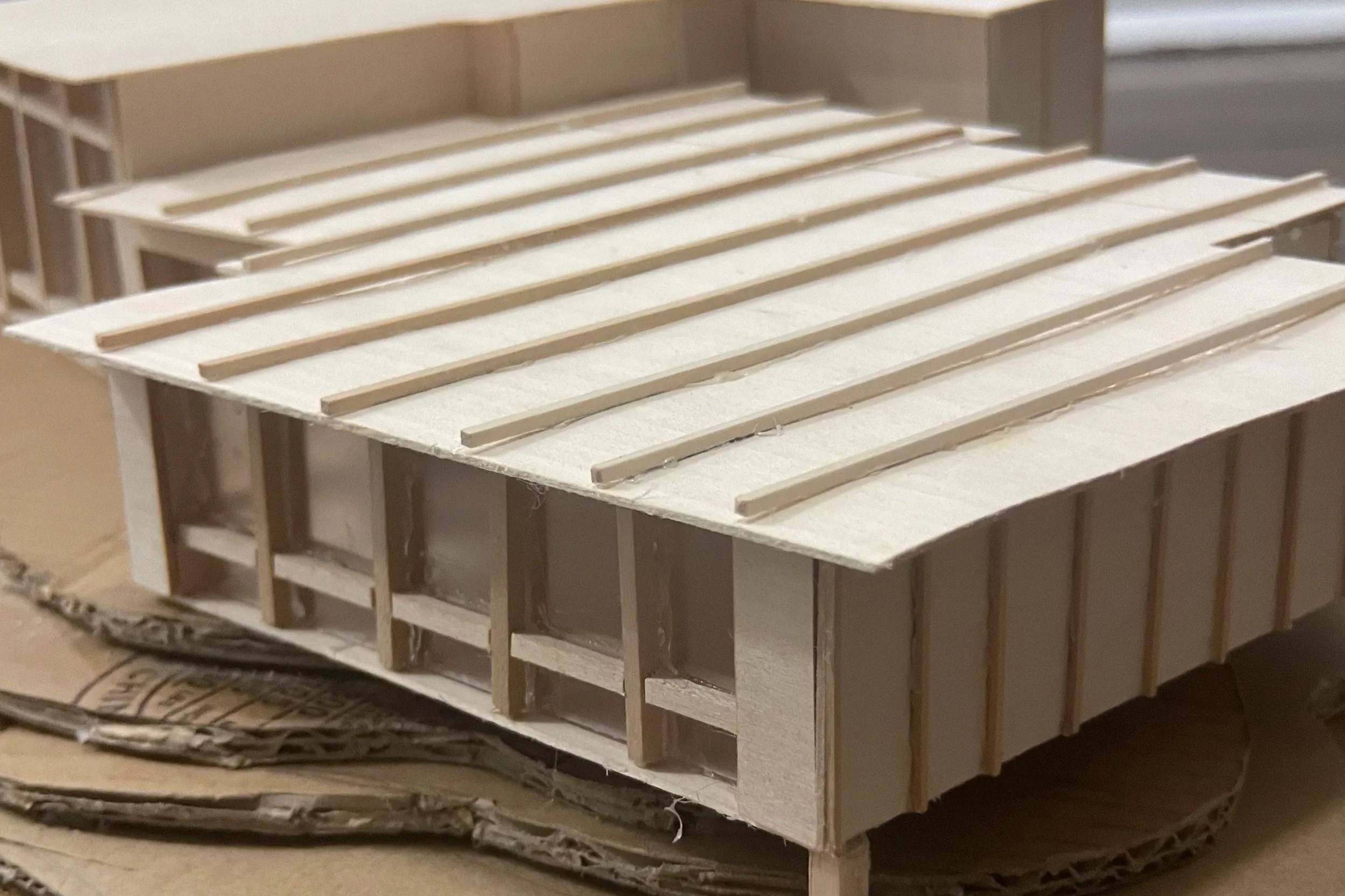 Balsa wood, hot glue, cork board, wooden rod, acrylic glass sheets, cardboard